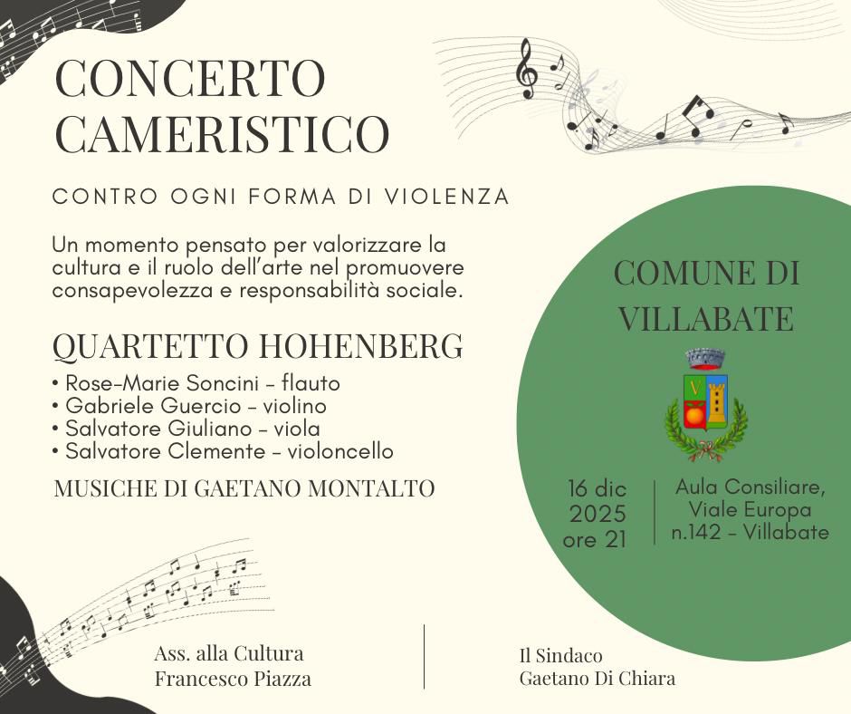 Il concerto del quartetto Hohenberg diretto dal Maestro Montalto Gaetano avrà luogo presso l'aula Consiliare giorno 16 dicembre alle ore 21.00